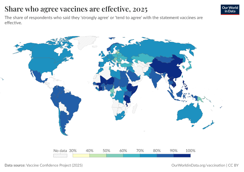 Vaccine Confidence Project (2025) – processed by Our World in Data. “Share who agree vaccines are effective” [dataset]. Vaccine Confidence Project, “Vaccine Confidence Index” [original data]. Retrieved February 27, 2026 from https://data-chartpreview-unify.owid.pages.dev:8789/20250909-093708/grapher/share-who-agree-vaccines-are-effective.html (archived on September 9, 2025).