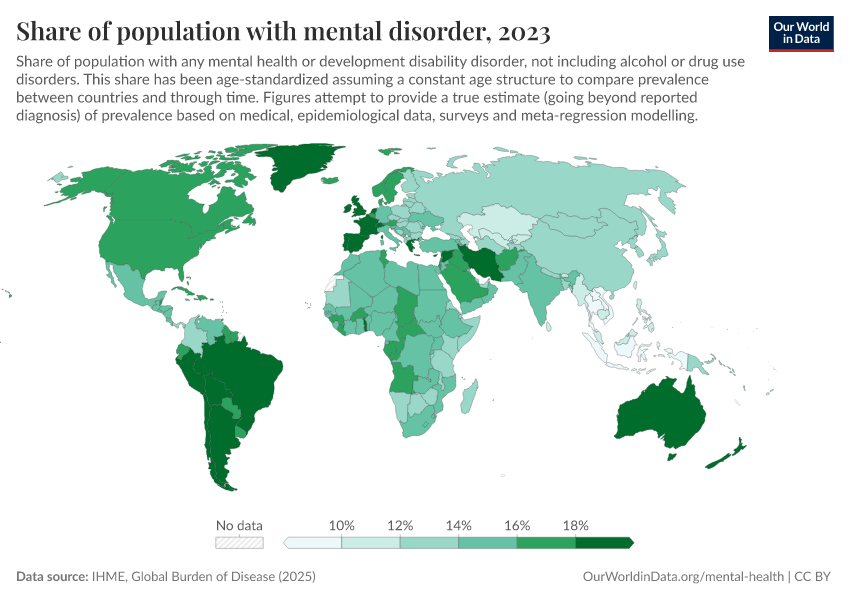 “Data Page: Share of population with mental disorder”, part of the following publication: Saloni Dattani, Lucas Rodés-Guirao, Hannah Ritchie, and Max Roser (2023) - “Mental Health”. Data adapted from IHME, Global Burden of Disease. Retrieved from https://data-chartpreview-unify.owid.pages.dev:8789/20260212-100858/grapher/share-with-mental-health-or-development-disorder.html [online resource] (archived on February 12, 2026).How to cite this data