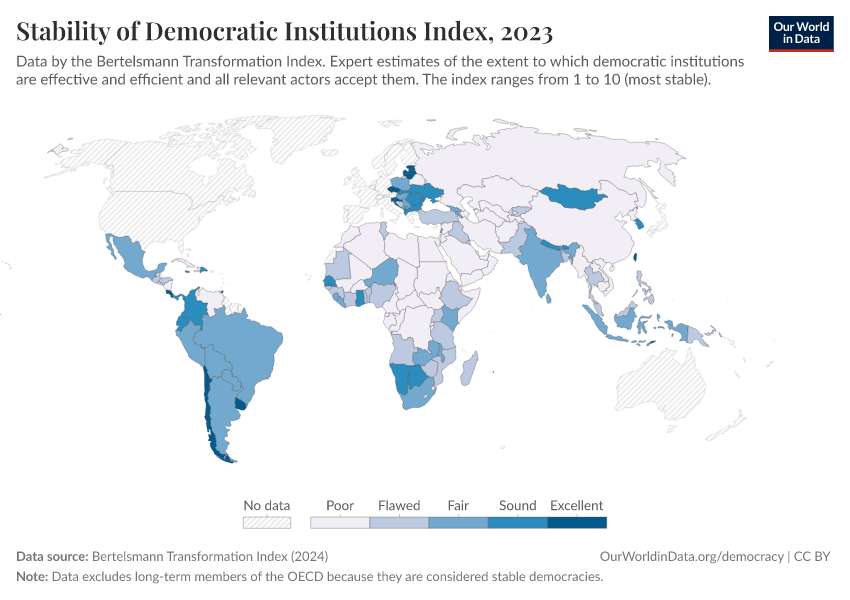 Bertelsmann Transformation Index (2024) – processed by Our World in Data. “Stability of Democratic Institutions Index” [dataset]. Bertelsmann Transformation Index, “Bertelsmann Transformation Index, Scores” [original data]. Retrieved February 27, 2026 from https://data-chartpreview-unify.owid.pages.dev:8789/20260105-133053/grapher/stability-democratic-institutions-index-bti.html (archived on January 5, 2026).