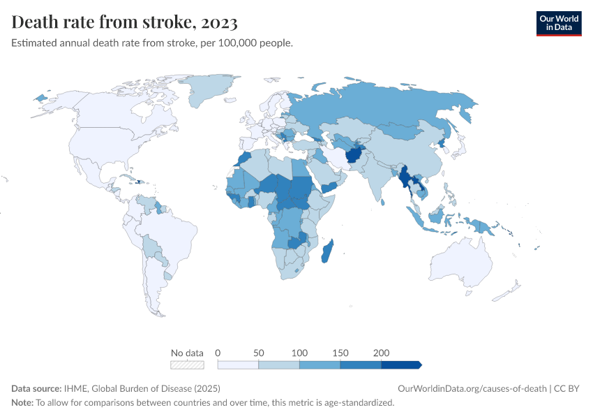 IHME, Global Burden of Disease (2025) – with major processing by Our World in Data. “Death rate from stroke” [dataset]. IHME, Global Burden of Disease, “Global Burden of Disease - Deaths” [original data]. Retrieved February 27, 2026 from https://data-chartpreview-unify.owid.pages.dev:8789/20260211-173942/grapher/stroke-death-rates.html (archived on February 11, 2026).