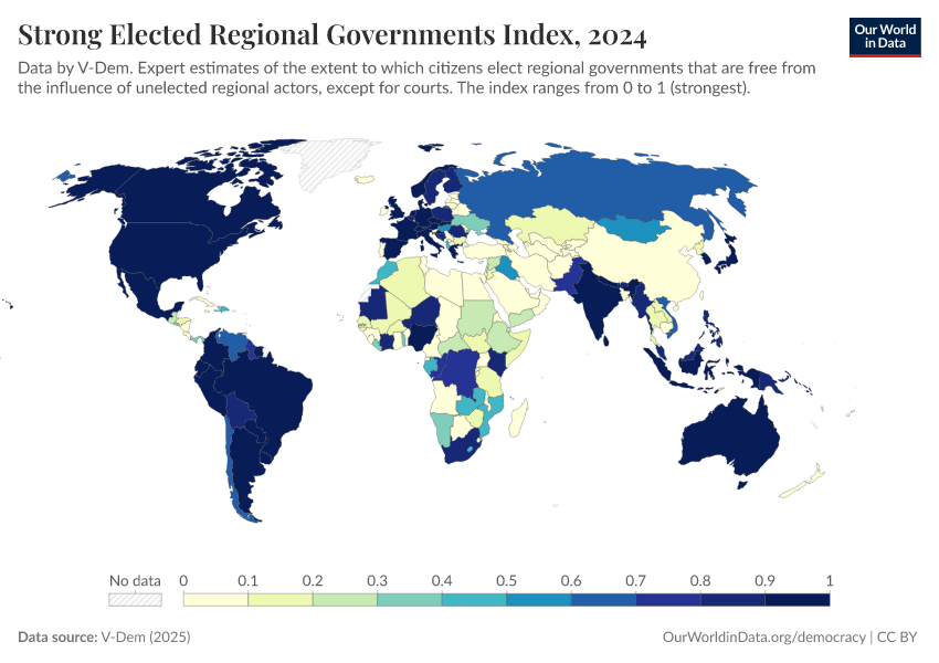 V-Dem (2025) – processed by Our World in Data. “Elected regional governments – V-Dem” [dataset]. V-Dem, “Democracy report v15” [original data]. Retrieved February 27, 2026 from https://data-chartpreview-unify.owid.pages.dev:8789/20260119-070102/grapher/strong-elected-regional-governments-index.html (archived on January 19, 2026).