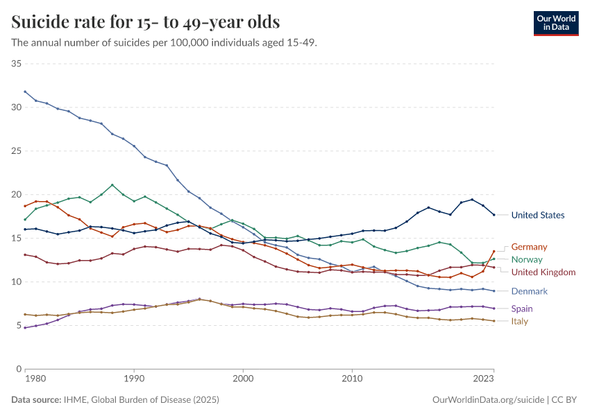 IHME, Global Burden of Disease (2025) – with major processing by Our World in Data. “Suicide rate for 15- to 49-year olds” [dataset]. IHME, Global Burden of Disease, “Global Burden of Disease - Deaths” [original data]. Retrieved February 27, 2026 from https://data-chartpreview-unify.owid.pages.dev:8789/20260211-174736/grapher/suicide-rate-for-15--to-49-year-olds.html (archived on February 11, 2026).