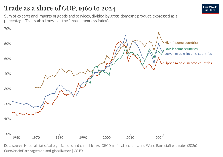 National statistical organizations and central banks, OECD national accounts, and World Bank staff estimates (2026) – processed by Our World in Data. “Trade as a share of GDP” [dataset]. National statistical organizations and central banks, OECD national accounts, and World Bank staff estimates, “World Development Indicators 125” [original data]. Retrieved February 27, 2026 from https://data-chartpreview-unify.owid.pages.dev:8789/20260225-205642/grapher/trade-as-share-of-gdp.html (archived on February 25, 2026).