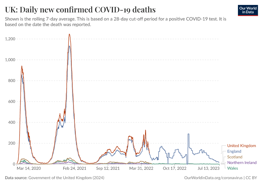 Government of the United Kingdom (2024) – with minor processing by Our World in Data. “UK: Daily new confirmed COVID-19 deaths” [dataset]. Government of the United Kingdom, “UKHSA data dashboard” [original data]. Retrieved February 27, 2026 from https://data-chartpreview-unify.owid.pages.dev:8789/20250909-093708/grapher/uk-daily-covid-deaths.html (archived on September 9, 2025).