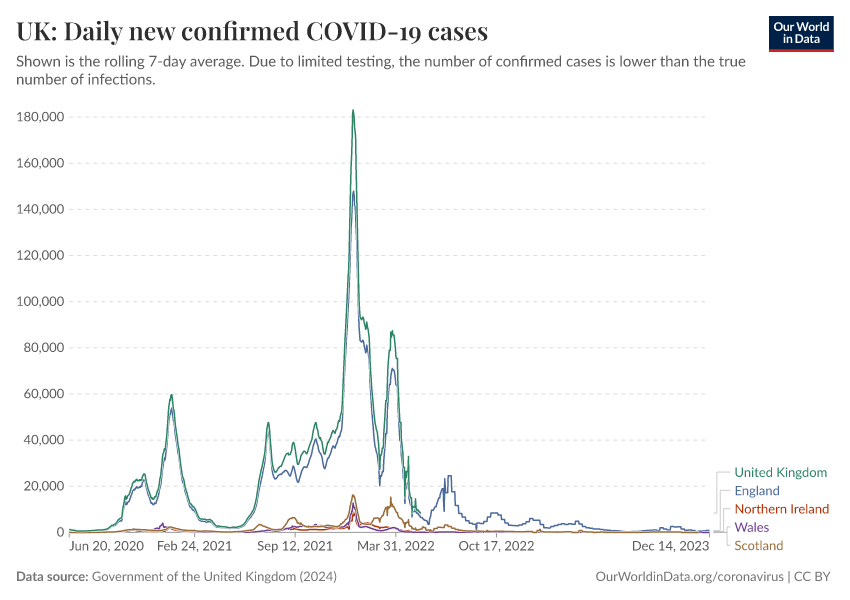 Government of the United Kingdom (2024) – with minor processing by Our World in Data. “UK: Daily new confirmed COVID-19 cases” [dataset]. Government of the United Kingdom, “UKHSA data dashboard” [original data]. Retrieved February 27, 2026 from https://data-chartpreview-unify.owid.pages.dev:8789/20250909-093708/grapher/uk-daily-new-covid-cases.html (archived on September 9, 2025).