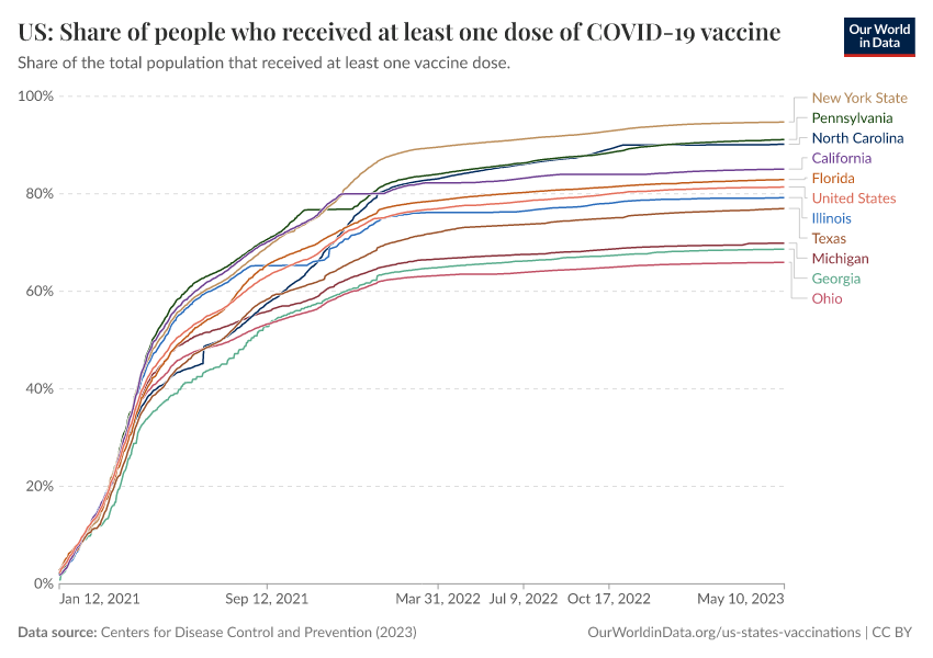 Centers for Disease Control and Prevention (2023) – processed by Our World in Data. “US: Share of people who received at least one dose of COVID-19 vaccine” [dataset]. Centers for Disease Control and Prevention, “COVID-19, Vaccinations (United States)” [original data]. Retrieved February 27, 2026 from https://data-chartpreview-unify.owid.pages.dev:8789/20250909-093708/grapher/us-covid-19-share-people-vaccinated.html (archived on September 9, 2025).