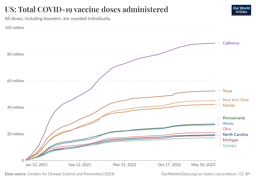 Centers for Disease Control and Prevention (2023) – processed by Our World in Data. “US: Total COVID-19 vaccine doses administered” [dataset]. Centers for Disease Control and Prevention, “COVID-19, Vaccinations (United States)” [original data]. Retrieved February 27, 2026 from https://data-chartpreview-unify.owid.pages.dev:8789/20250909-093708/grapher/us-total-covid-19-vaccine-doses-administered.html (archived on September 9, 2025).