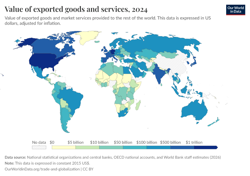 “Data Page: Value of exported goods and services”. Our World in Data (2026). Data adapted from National statistical organizations and central banks, OECD national accounts, and World Bank staff estimates. Retrieved from https://data-chartpreview-unify.owid.pages.dev:8789/20260202-181317/grapher/value-of-exported-goods-and-services.html [online resource] (archived on February 2, 2026).How to cite this data