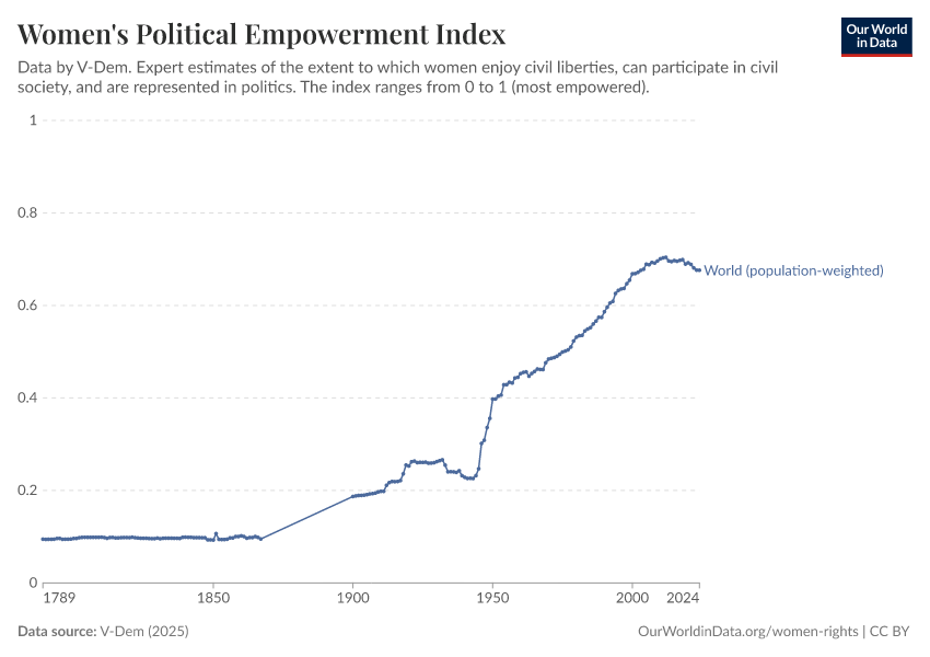 “Data Page: Women's political empowerment index”, part of the following publication: Bastian Herre, Lucas Rodés-Guirao, and Esteban Ortiz-Ospina (2013) - “Democracy”. Data adapted from V-Dem. Retrieved from https://data-chartpreview-unify.owid.pages.dev:8789/20260119-070102/grapher/women-political-empowerment-index.html [online resource] (archived on January 19, 2026).