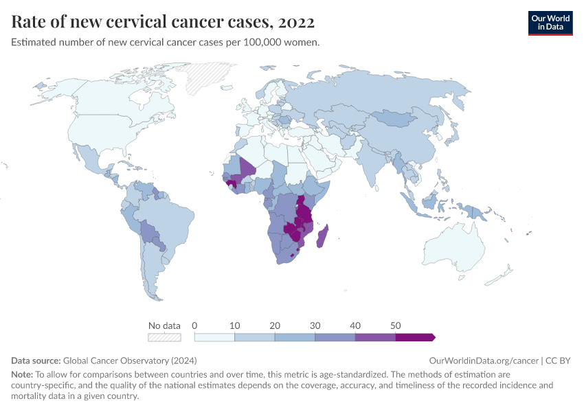 The map shows that cervical cancer is much more common in Africa and South America than in other regions.