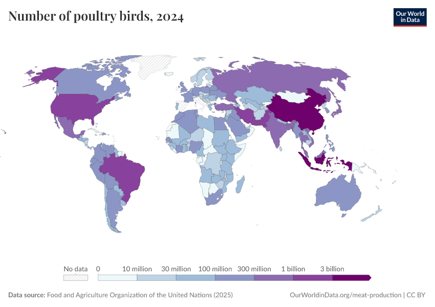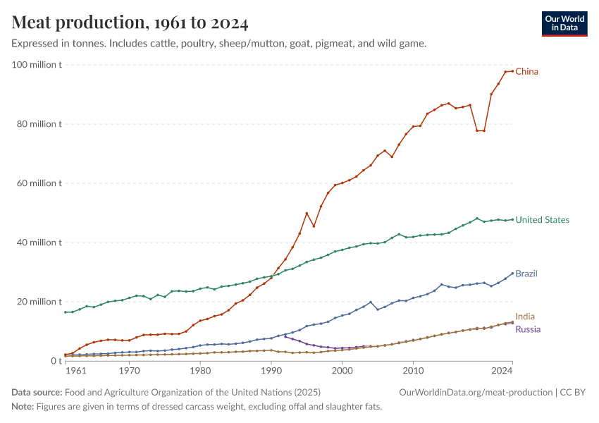 Hannah Ritchie, Pablo Rosado, and Max Roser (2019) - “Meat and Dairy Production” Published online at OurWorldinData.org. Retrieved from: 'https://data-chartpreview-unify.owid.pages.dev/meat-production' [Online Resource]BibTeX citation