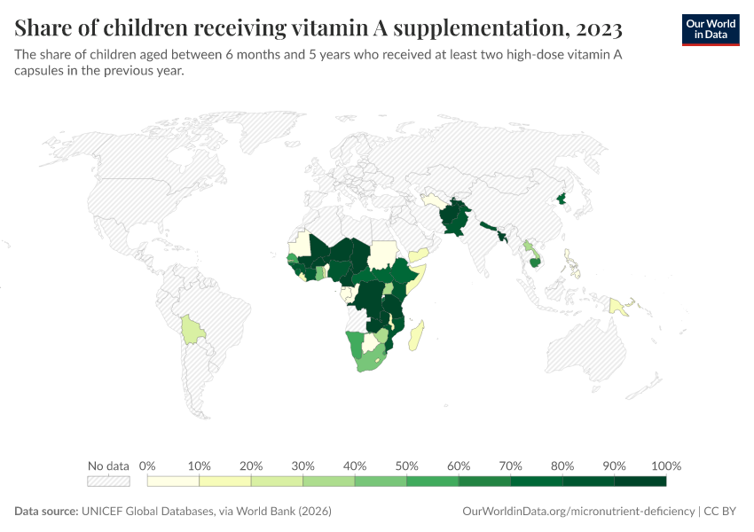 Vitamin A supplementation is relatively common in many countries in Africa and South Asia, although some countries still have low rates of supplementation.