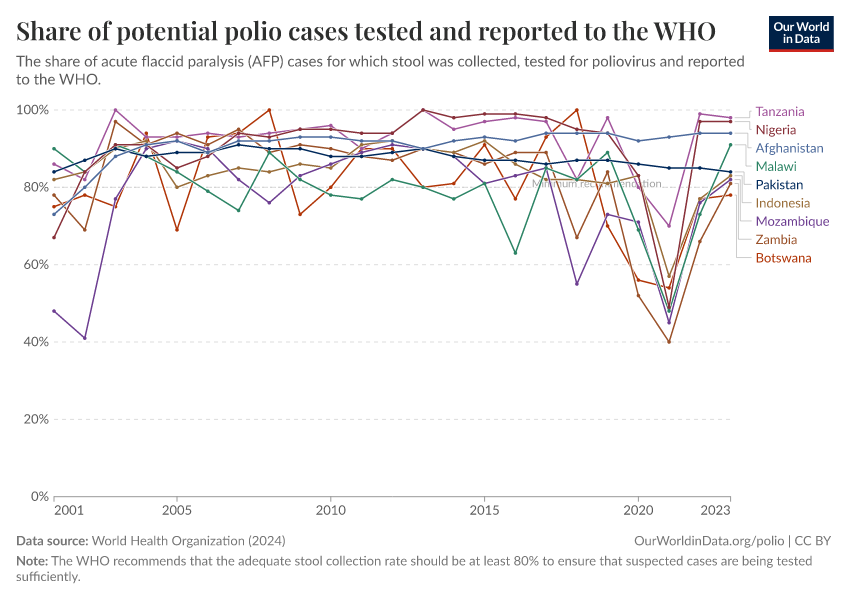 Saloni Dattani and Fiona Spooner (2022) - “We need more testing to eradicate polio worldwide” Published online at OurWorldinData.org. Retrieved from: 'https://data-chartpreview-unify.owid.pages.dev:8789/20260119-065148/polio-testing.html' [Online Resource] (archived on January 19, 2026).BibTeX citation