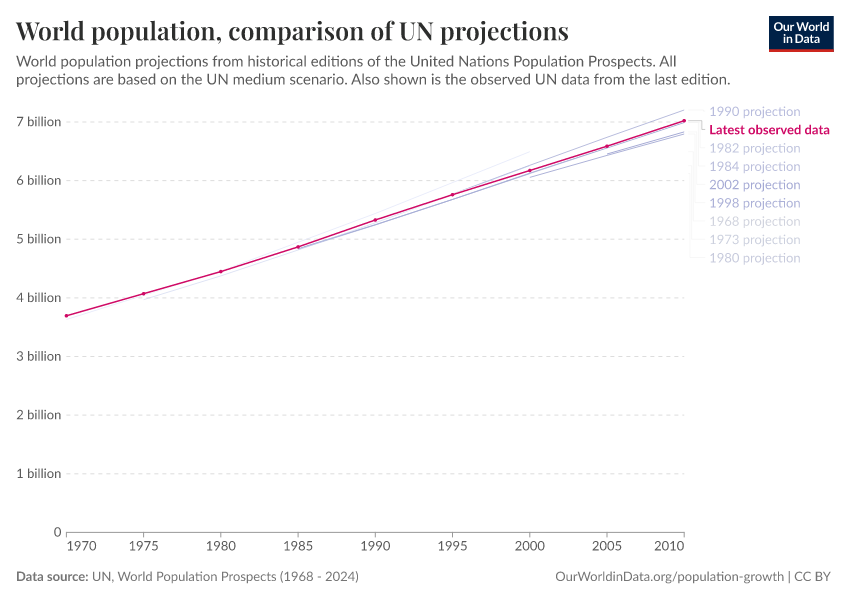 Here we look at UN reports dating back to 1968 – it was not possible to find earlier versions of UN reports. However, other studies note that projections in the 1950s had much larger error margins: they were often out by more than 10%.