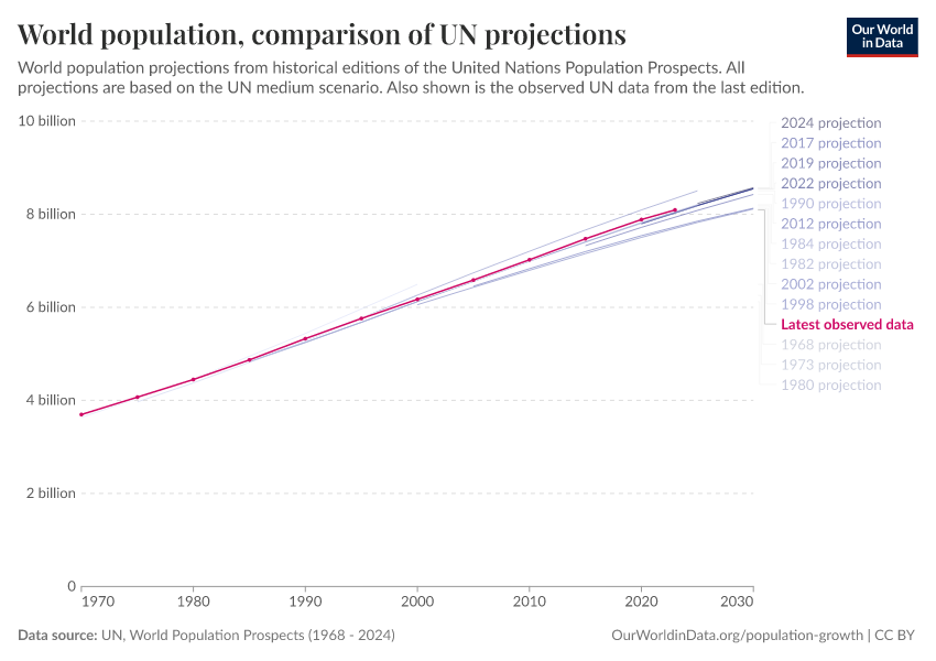 Hannah Ritchie (2023) - “The UN has made population projections for more than 50 years – how accurate have they been?” Published online at OurWorldinData.org. Retrieved from: 'https://data-chartpreview-unify.owid.pages.dev:8789/20251125-173858/population-projections.html' [Online Resource] (archived on November 25, 2025).BibTeX citation