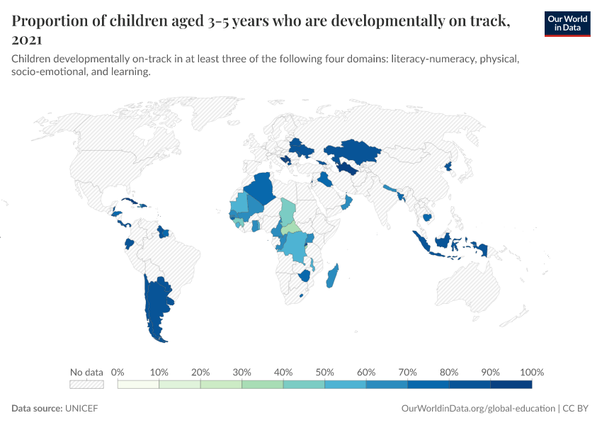 Since internationally comparable data for this indicator is not currently available, this is measured by the United Nations through a proxy indicator defined as the proportion of children aged 36-59 months in each country who are developmentally on-track in at least three of the following four domains: literacy-numeracy, physical, socio-emotional and learning.