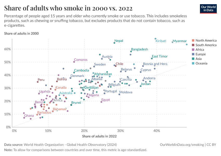 In this visualization, we see the share of adults who smoked in the year 2000 (on the y-axis) and in the most recent data (on the x-axis). The grey line here shows parity: countries that lie along this line would have the same smoking prevalence at both points in time. Countries that lie above this line had higher smoking prevalence back in 2000; for those below the opposite is true.