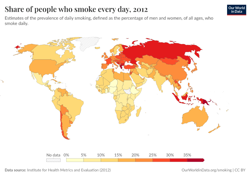 We see that daily smoking is most common across Europe and Asia – more than 20% of people in most countries in these regions smoke every day.