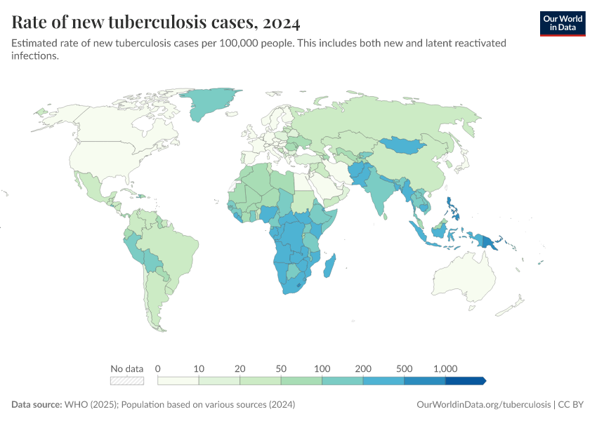 Saloni Dattani, Fiona Spooner, Hannah Ritchie, and Max Roser (2023) - “Tuberculosis” Published online at OurWorldinData.org. Retrieved from: 'https://data-chartpreview-unify.owid.pages.dev/tuberculosis' [Online Resource]BibTeX citation