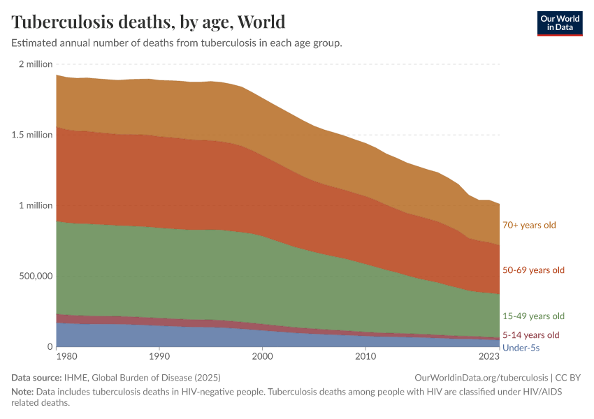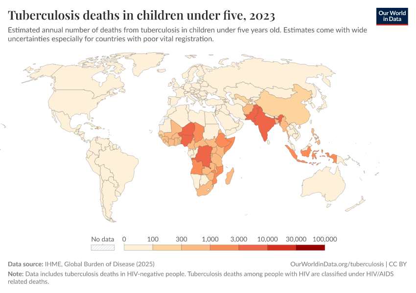 Typically, in international statistics, “tuberculosis deaths” refers to deaths in HIV-negative people, while tuberculosis deaths among people with HIV are classified under “HIV/AIDS related deaths”.