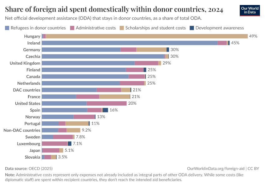 Another element that may be surprising is student scholarships — these can count as aid when they align with the host country's development plans.13 For most countries, this contribution is very small. But there are a few exceptions. Hungary is the most extreme case: it uses 41% of its aid budget for foreign students. In addition to refugee support and scholarships, aid money spent domestically includes funding for development awareness programs and administrative costs not already incorporated into specific aid initiatives.
